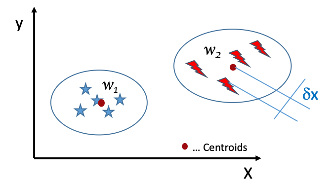 Mathematisch wird die Varianz eines neuen Elements zu den Clusteroiden ermittelt und das Element dem Ergebnis entsprechend einer Gruppe (einem Cluster) zugeordnet.